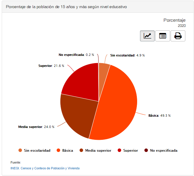 Por otro lado, de acuerdo con las estadísticas del censo 2020 de INEGI, el porcentaje de personas mayores de 15 años en un nivel superior de educación en nuestro país es de 21.6% de la población, sin embargo, las estadísticas no indican en qué medida este segmento poblacional concluyó este nivel de educación. Observemos la gráfica: